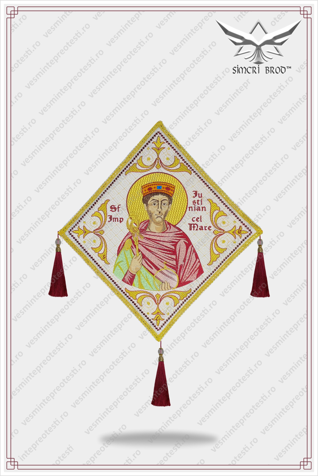 Επιγονάτιο κεντημένο με τον Άγιο Αυτοκράτορα Ιουστινιανό – Τα ιερατικά άμφια SimcriBrod κατασκευάζονται στην Ευρώπη από αδελφούς μας στην πίστη, με παραδοσιακή χειροποίητη τεχνοτροπία και υψηλή ποιότητα.