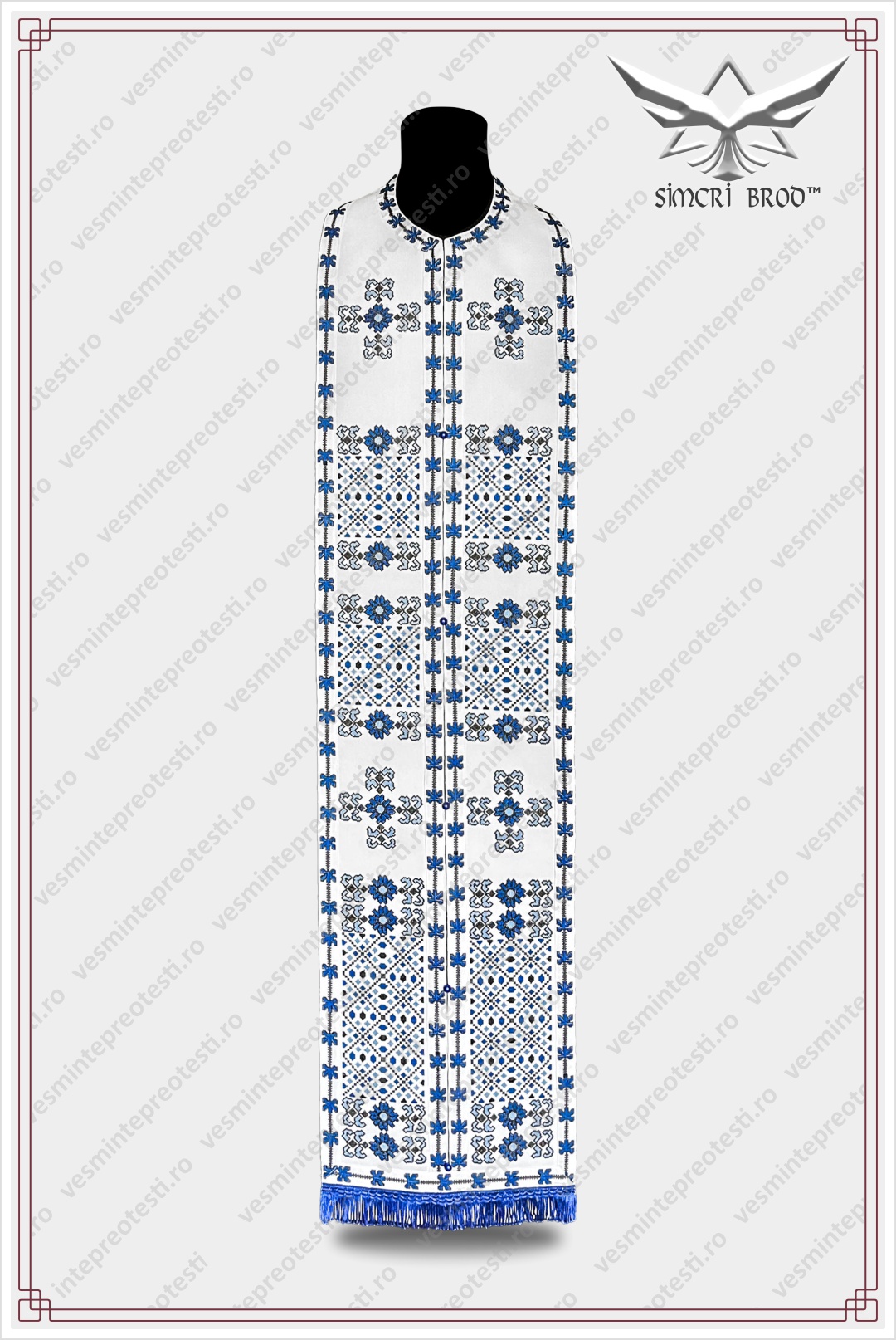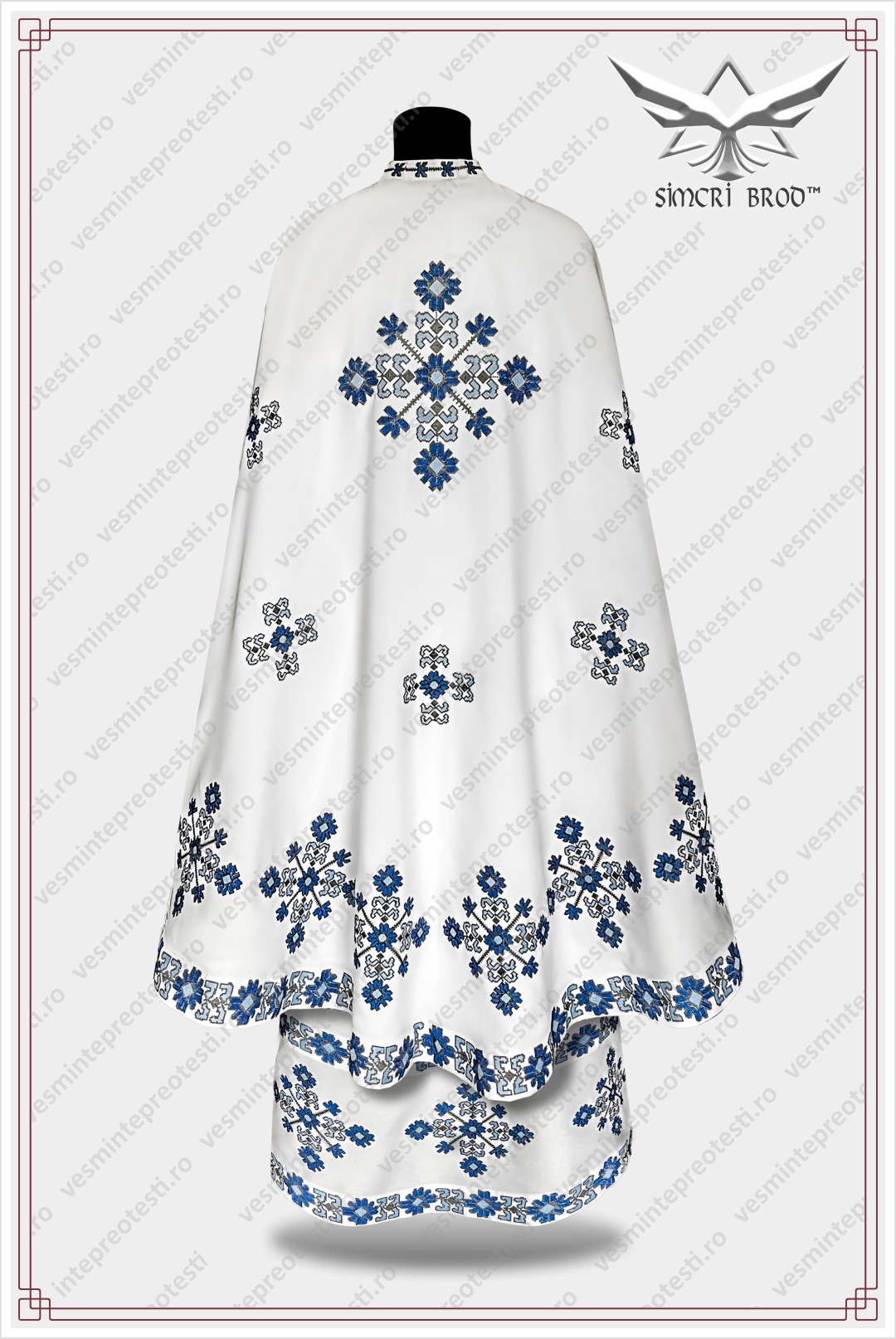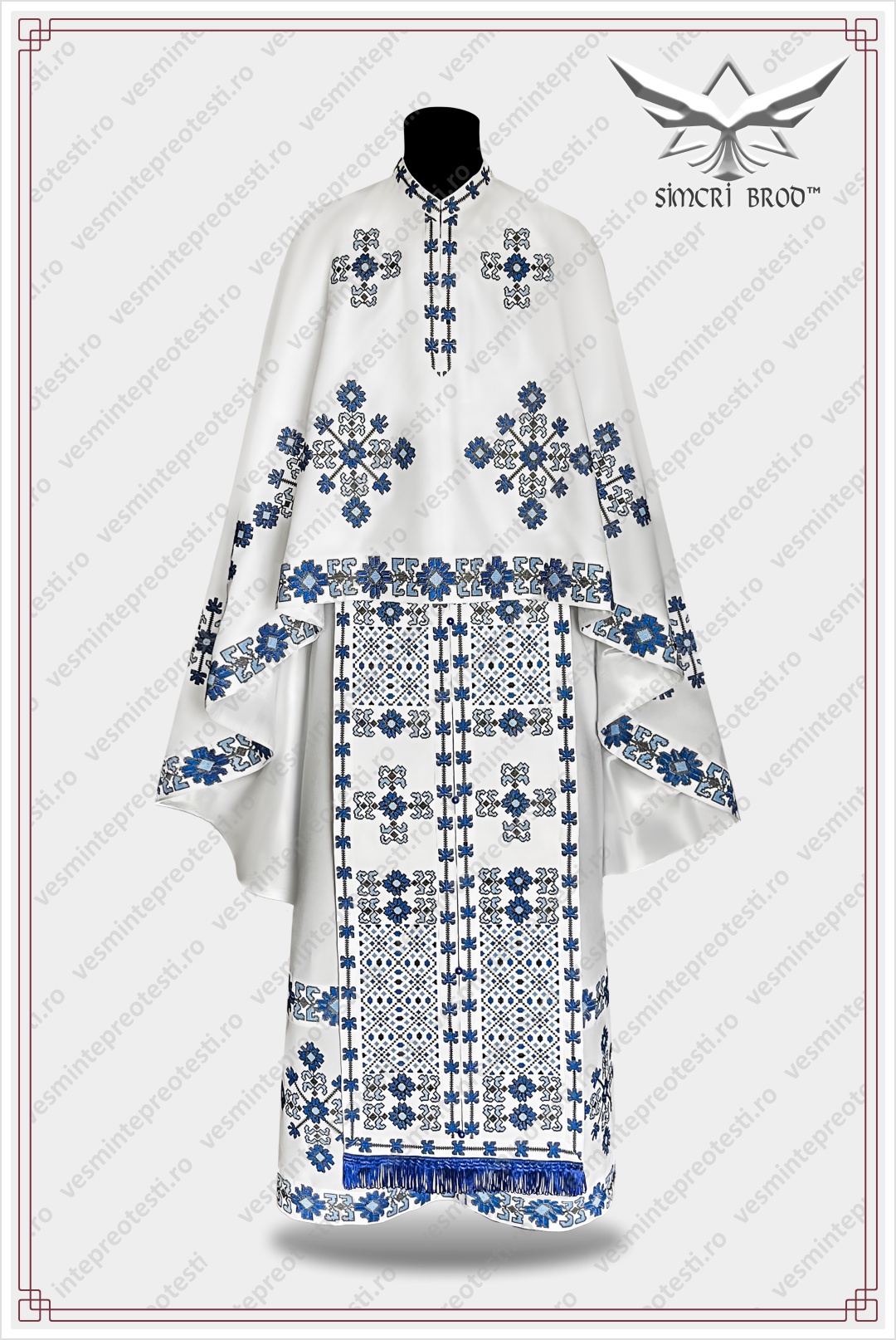 Ιερατικά άμφια κεντημένα Παραδοσιακό 1 λευκά/μπλε – Τα ιερατικά άμφια SimcriBrod κατασκευάζονται στην Ευρώπη από αδελφούς μας στην πίστη, με παραδοσιακή χειροποίητη τεχνοτροπία και υψηλή ποιότητα.