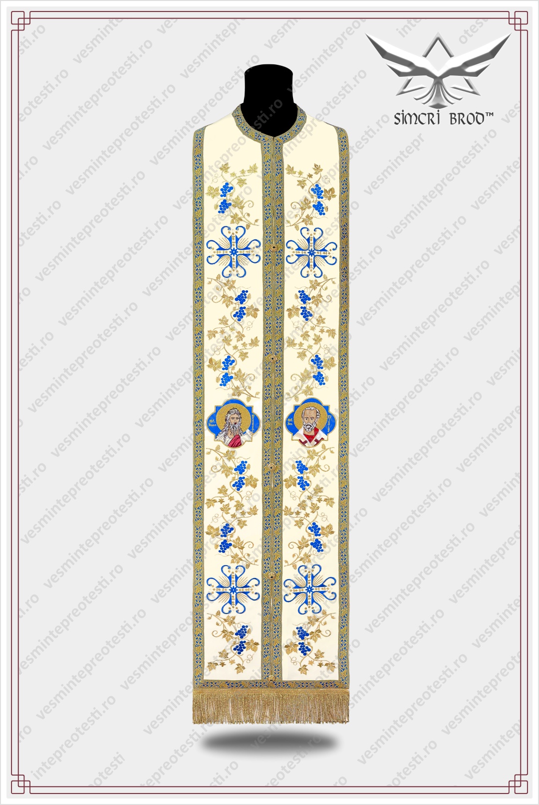 Το φτερό του ιερατικού άμφου είναι κεντημένο γύρω-γύρω με κλαδιά αμπέλου, με κλαδιά κληματαριάς και σταυρούς με τα κλαδιά και το σταυρό. στο επιτραχήλιο μπορείτε να βρείτε τα ίδια κλαδιά αμπέλου σε συνδυασμό με σταυρούς και εικόνες με τον Άγιο Ιεράρχη Νικόλαο και τον Άγιο Ιωάννη τον Πρόδρομο – κατόπιν παραγγελίας, οι εικόνες μπορούν να αντικατασταθούν σύμφωνα με την προτίμηση του πελάτη.