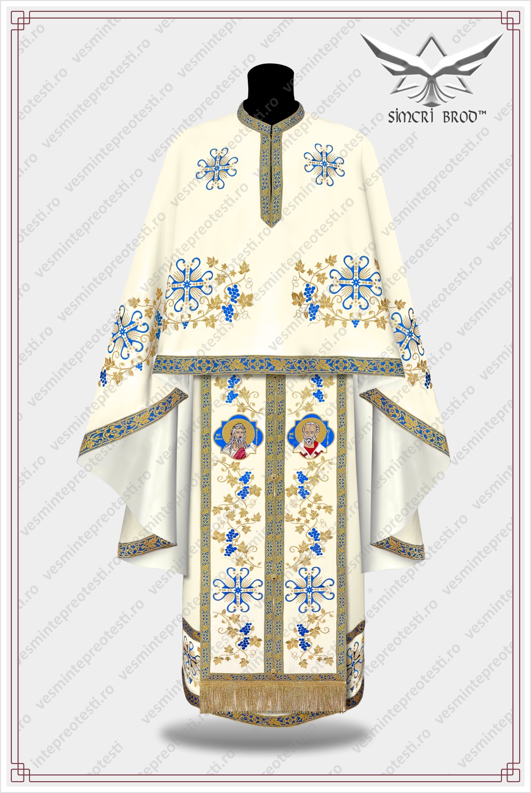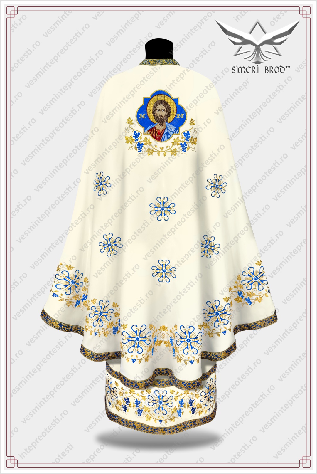 Ιερατικά άμφια κεντημένα B-25 κρεμ/μπλε – Τα ιερατικά άμφια SimcriBrod κατασκευάζονται στην Ευρώπη από αδελφούς μας στην πίστη, με παραδοσιακή χειροποίητη τεχνοτροπία και υψηλή ποιότητα.