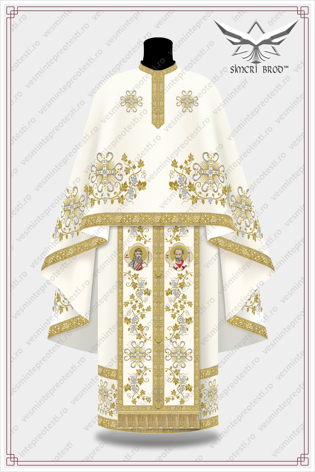 Το φτερό του ιερατικού άμφου είναι κεντημένο γύρω-γύρω με κλαδιά αμπέλου, με κλαδιά κληματαριάς και σταυρούς με τα κλαδιά και το σταυρό. στο επιτραχήλιο μπορείτε να βρείτε τα ίδια κλαδιά αμπέλου σε συνδυασμό με σταυρούς και εικόνες με τον Άγιο Ιεράρχη Νικόλαο και τον Άγιο Ιωάννη τον Πρόδρομο – κατόπιν παραγγελίας, οι εικόνες μπορούν να αντικατασταθούν σύμφωνα με την προτίμηση του πελάτη.