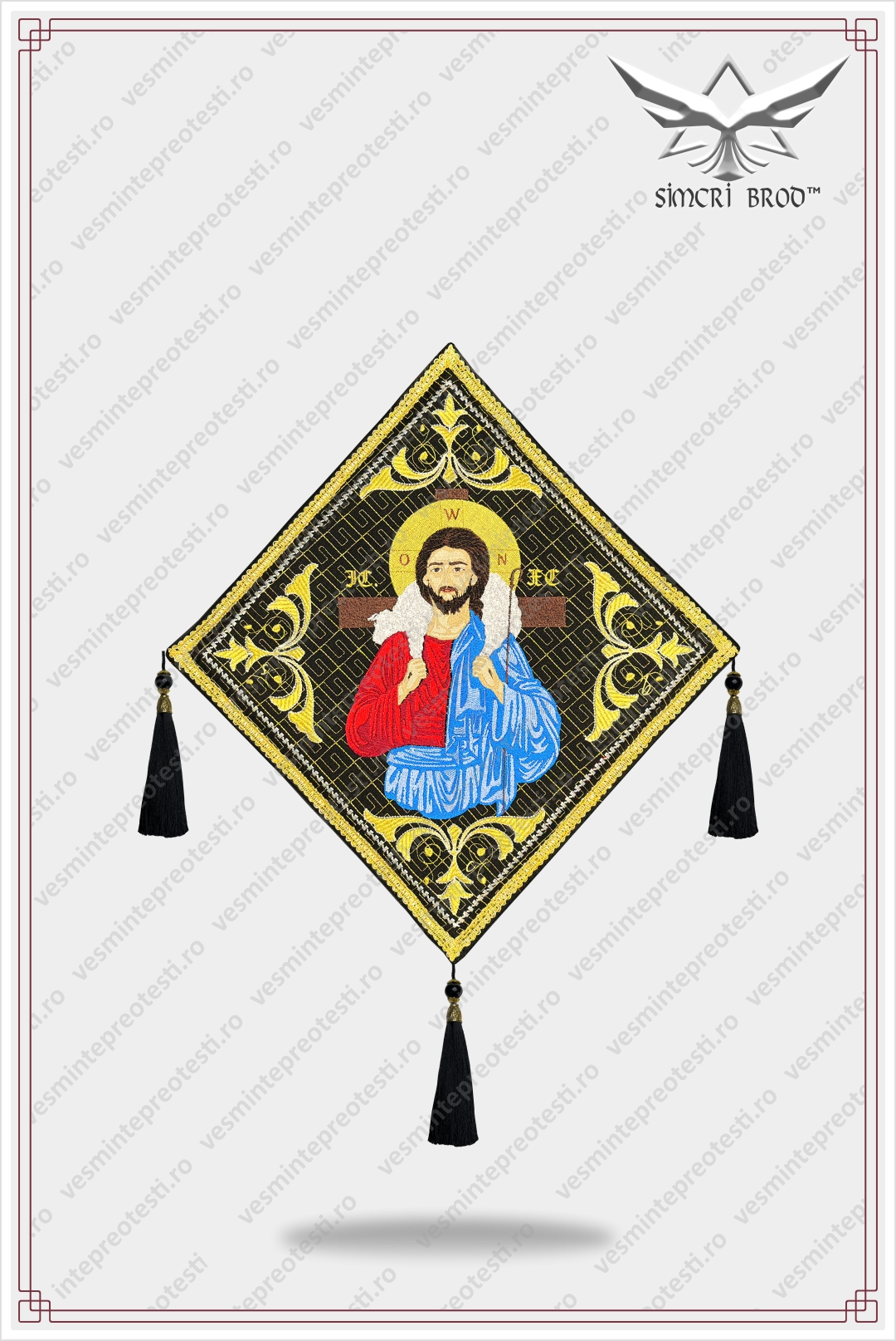 This rhomboid is made with meticulous attention to detail, featuring the embroidered face of Jesus the Good Shepherd, an image full of peace and goodness. The fine embroidery, with harmonious shades and precise stitching, delicately renders the gentle expression and compassionate gaze of the Savior.