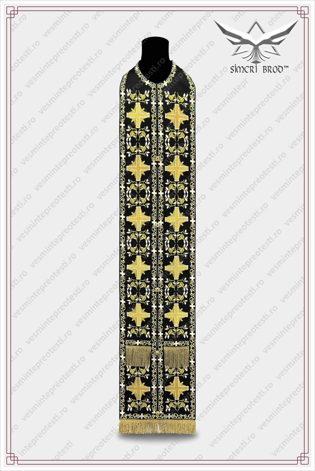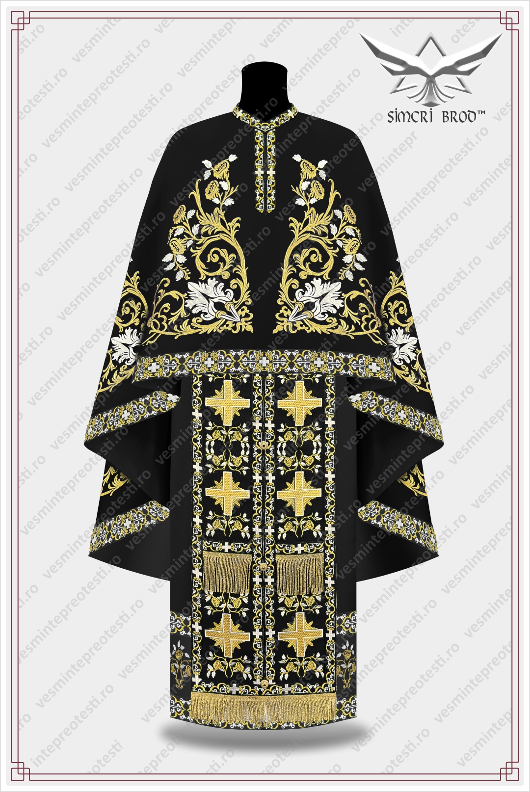 The black color of priest vestments symbolizes repentance and sorrow, and traditionally they are worn at funeral services during Great Lent, as well as at funerals or other religious services. Byzantine arabesques and floral motifs beautify this vestment through rich embroidery that adorns the felonion all around.