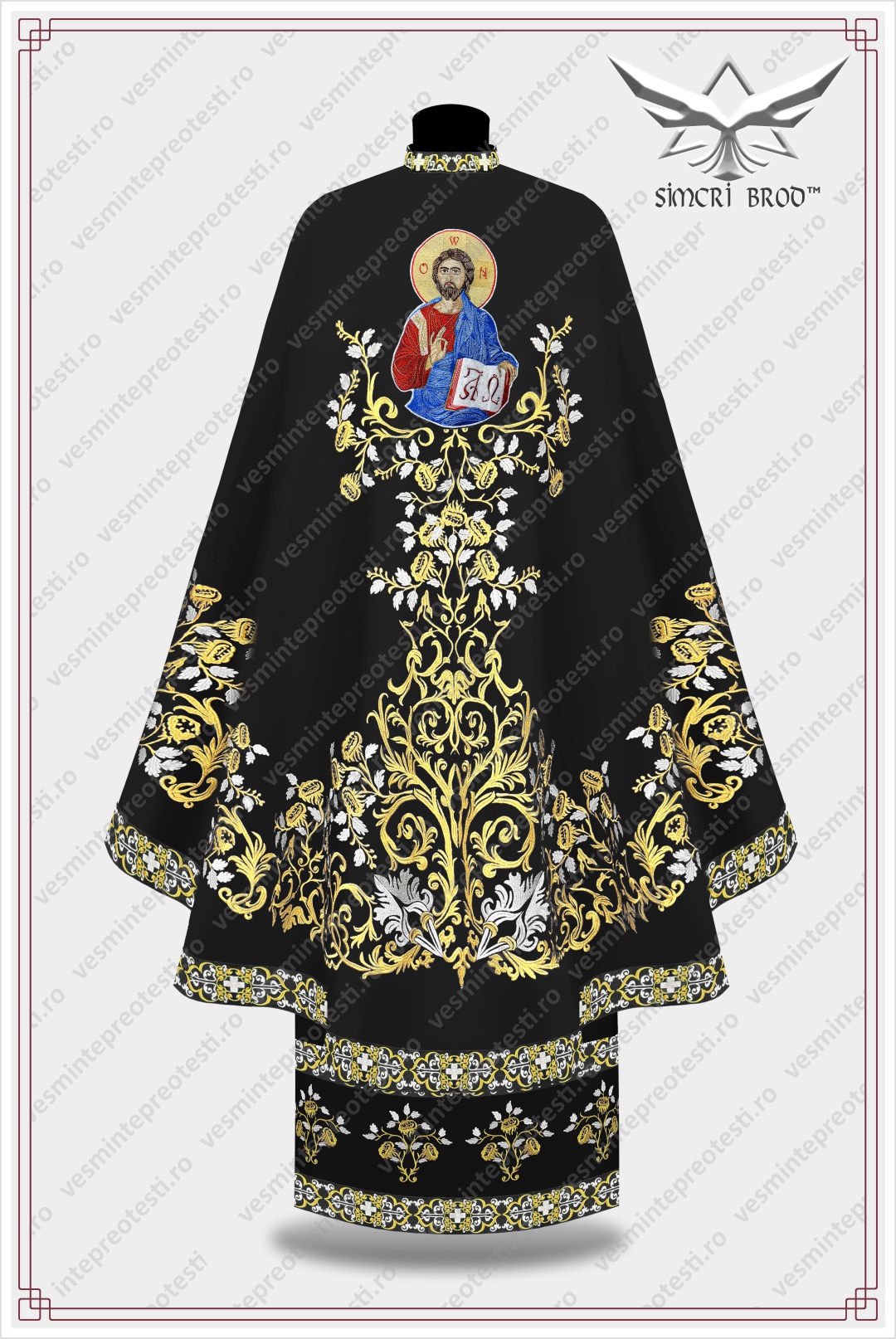 The icon of our Saviour Christ stands on the back, beautifully supported by floral elements—motifs that also appear on the epitrachelion, belt, and cuffs, as well as on the coverings for the Holy Vessels. The embroidered trim outlining each piece of the vestment adds an extra touch of beauty and elegance.