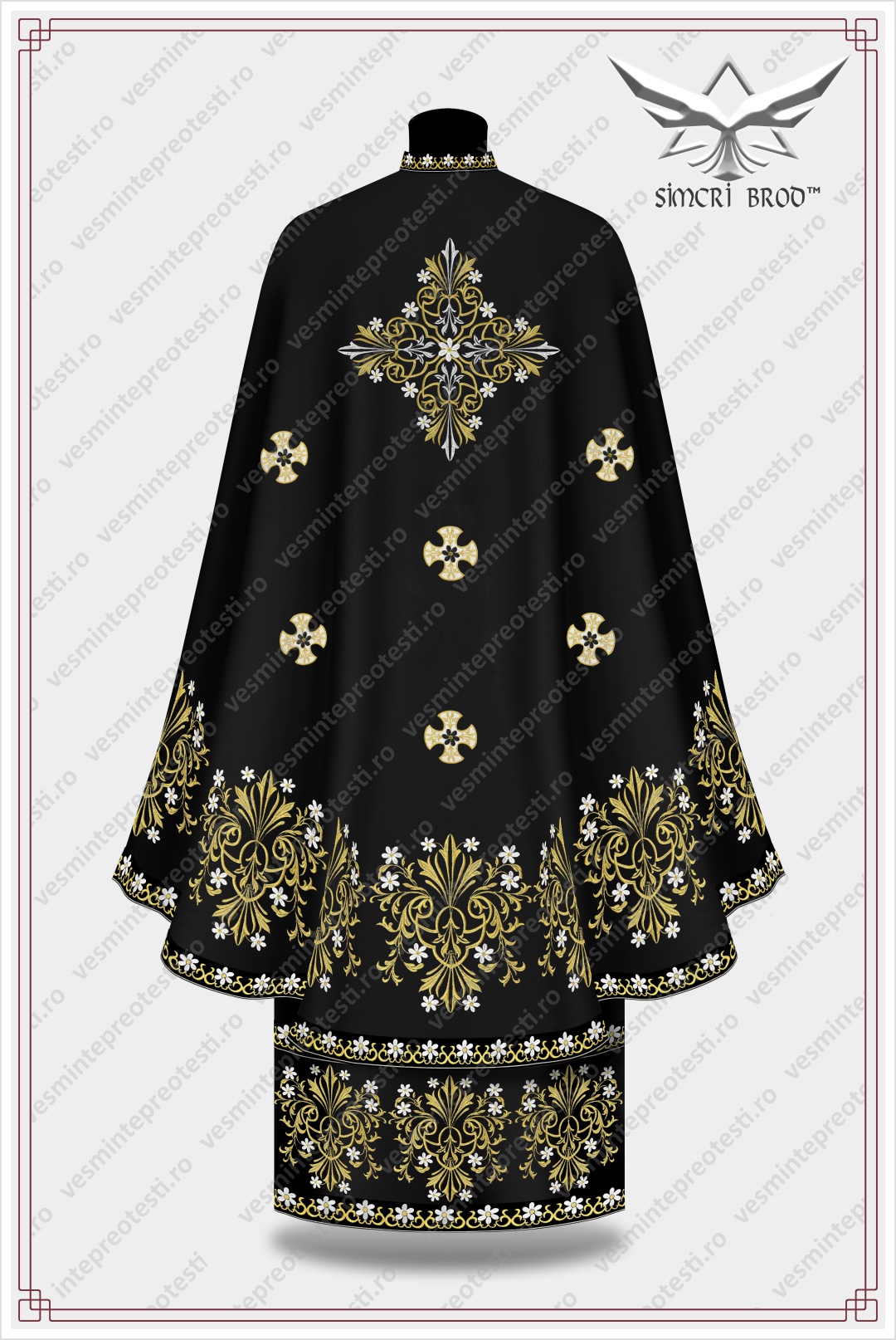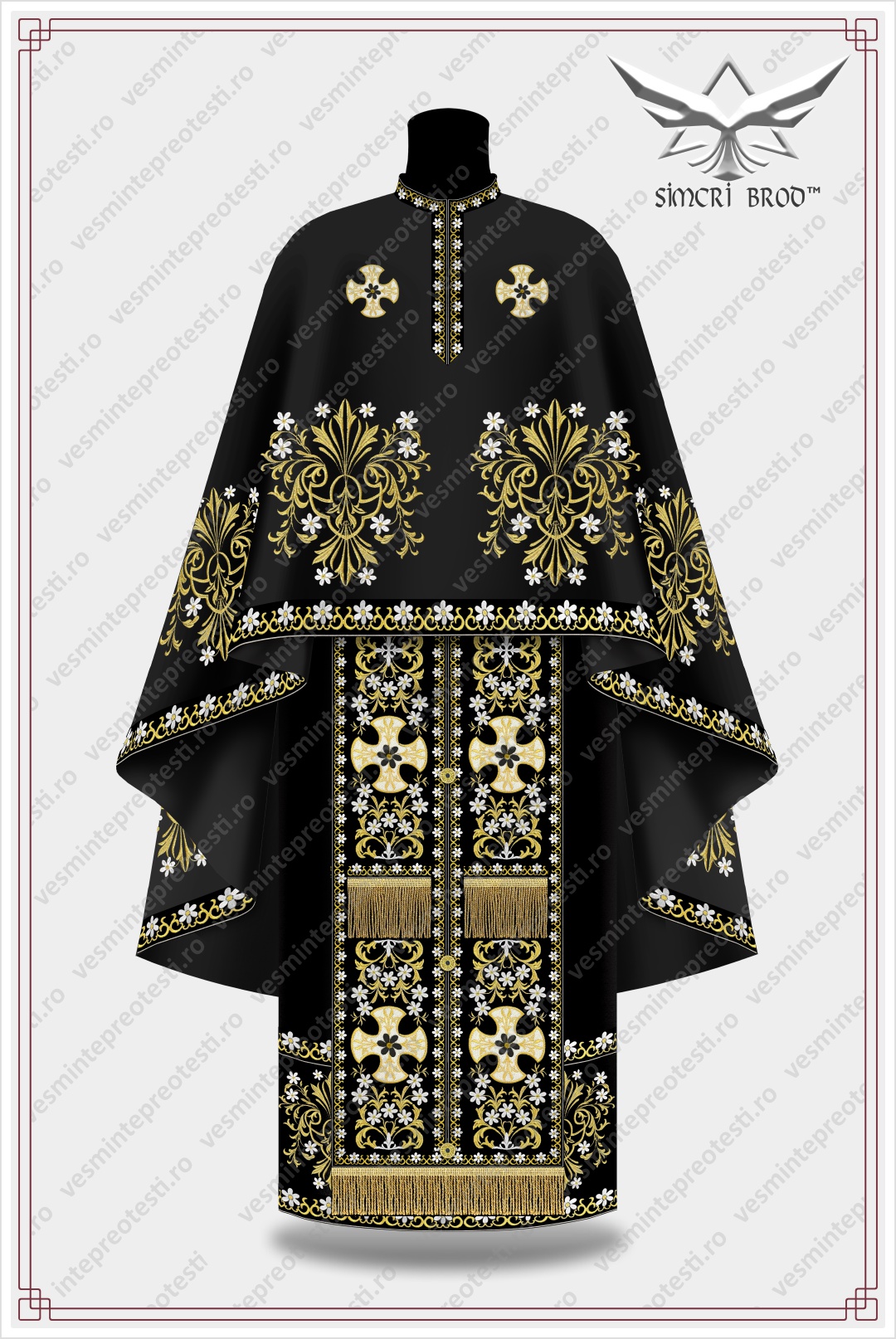The felon at the bottom is embellished with floral bouquets forming a border all around, and the stylized cross on the back is also composed of floral elements. The stichar has embroidery at the bottom similar to that on the felon, thus extending it, and the epitrahil richly ornamented with flowers and crosses elegantly completes the overall image of the vestment. The arm, sleeves and coverings for the Holy Vessels are also embroidered in tone with the vestment.