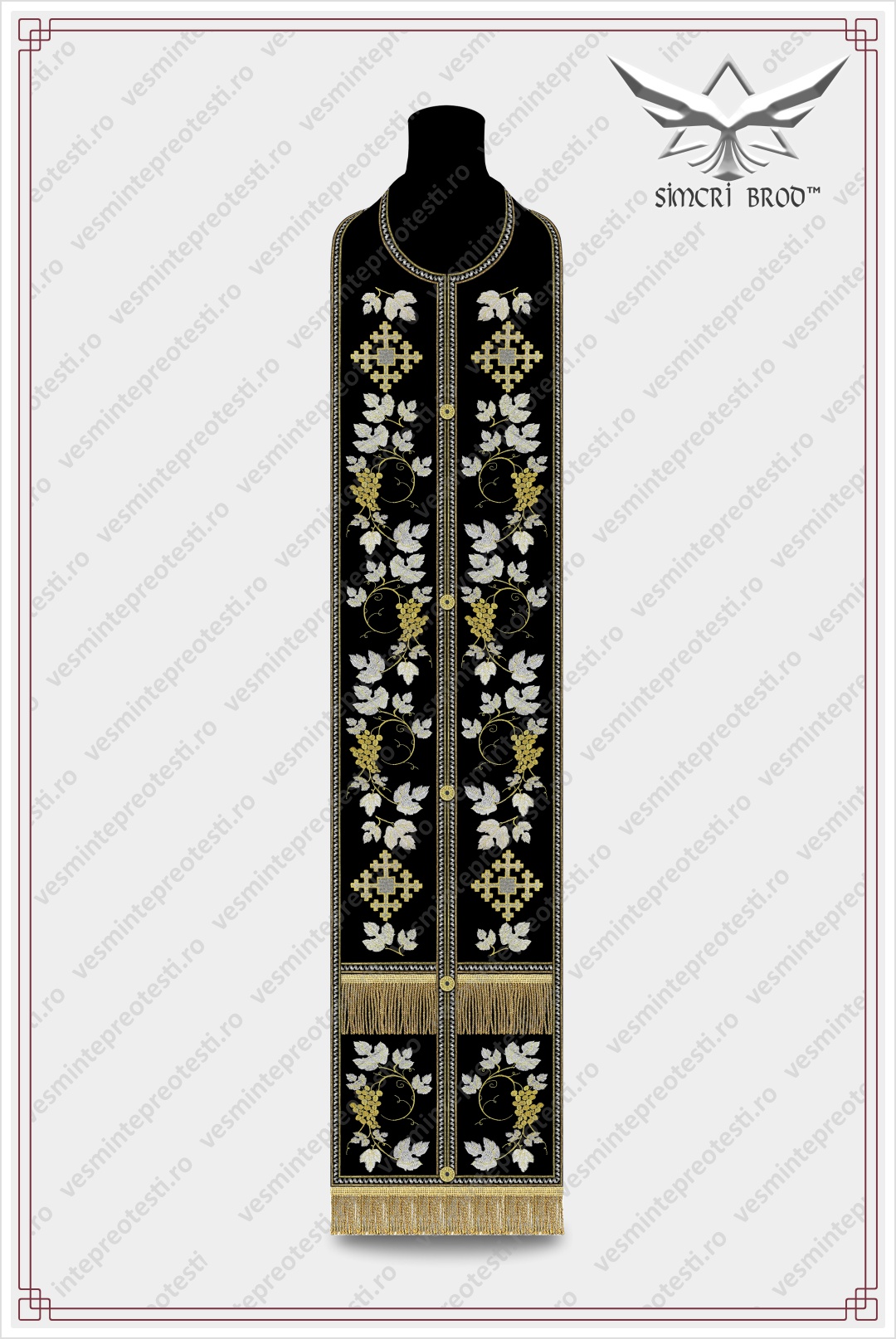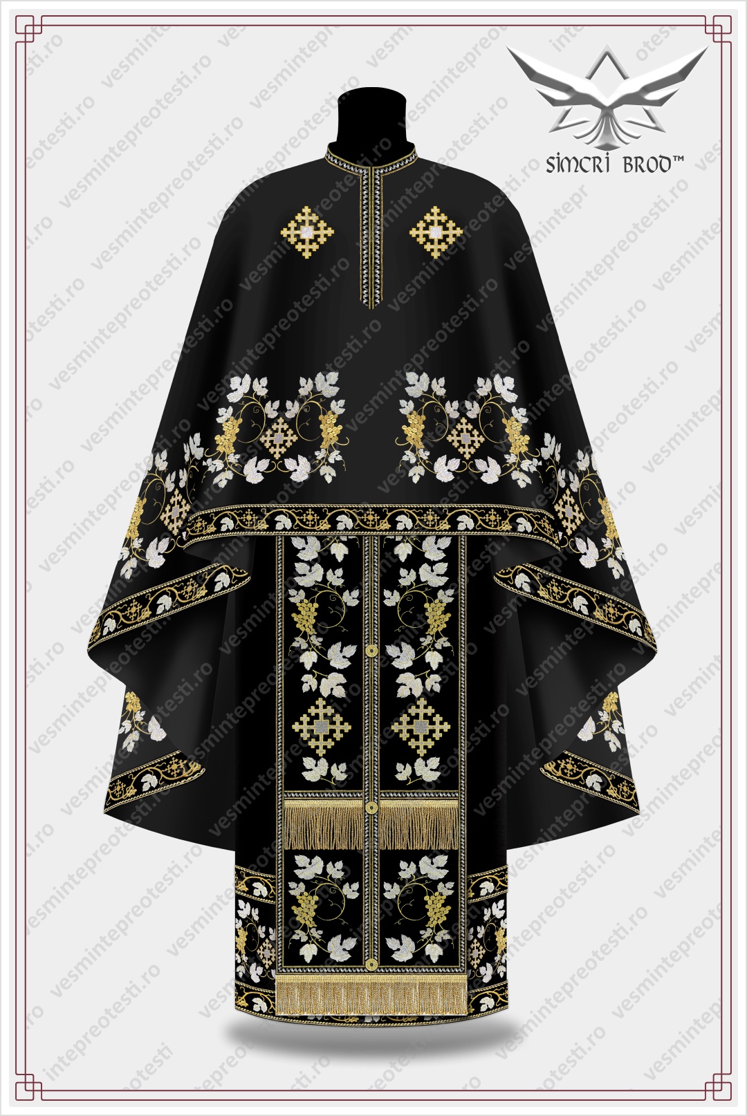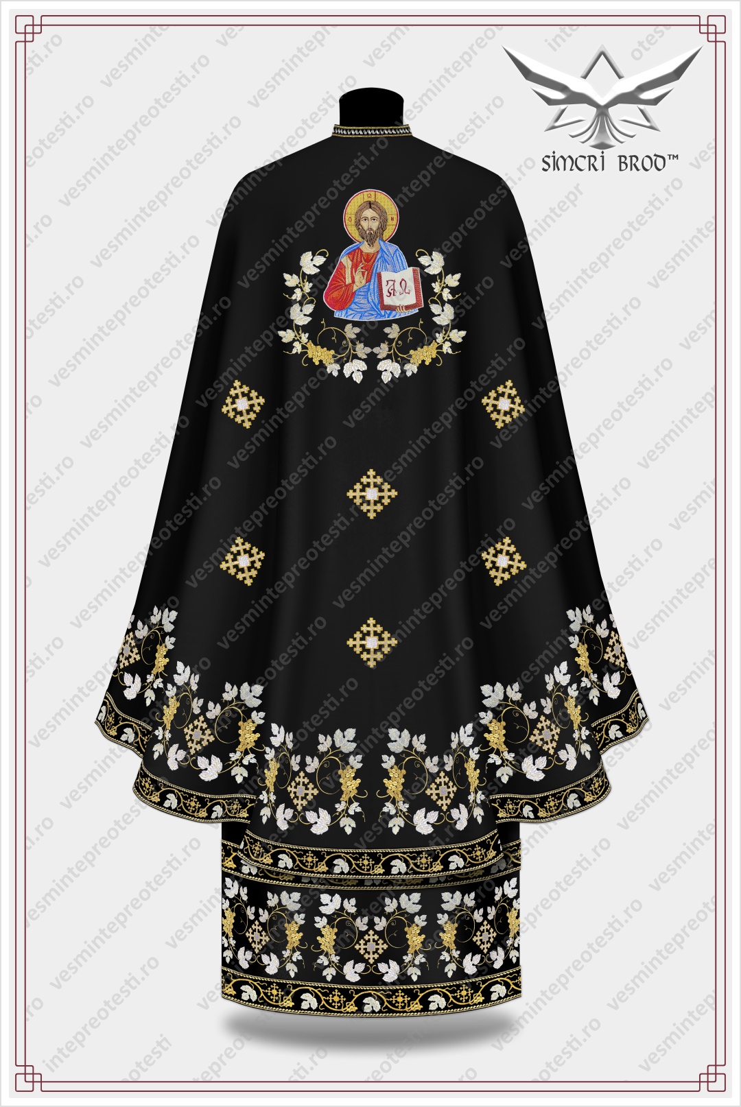 The icon of the Saviour on the felonion is highlighted by vine branches, and the lower part of the felonion is adorned with the same branches that harmoniously surround the Holy Cross. The other elements of the vestment—the belt, cuffs, and coverings for the Holy Vessels—are embroidered to match the rest of the vestment, and the embroidered trim bordering each piece adds an extra touch of elegance and beauty.
