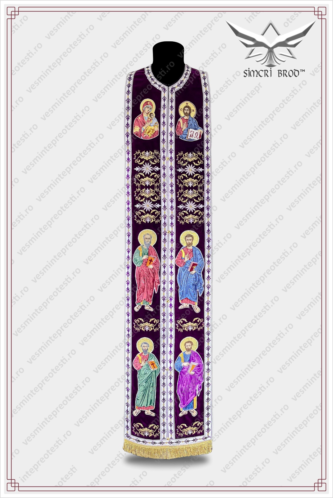 The priest vestment is embroidered on exceptionally high-quality purple velvet — imported from Germany — with a rich floral pattern that beautifully outlines the felonion all around. On the back, the icon of our Lord seated on the throne is prominently displayed, highlighted by floral branches. The epitrachelion is adorned with the four Evangelists standing, and at the chest with the icons of the Mother of God and Jesus Christ. The belt, cuffs, and coverings for the Holy Vessels are also embroidered to match the vestment, while the embroidered trim outlining each element uniquely emphasizes the beauty of the embroidery.
