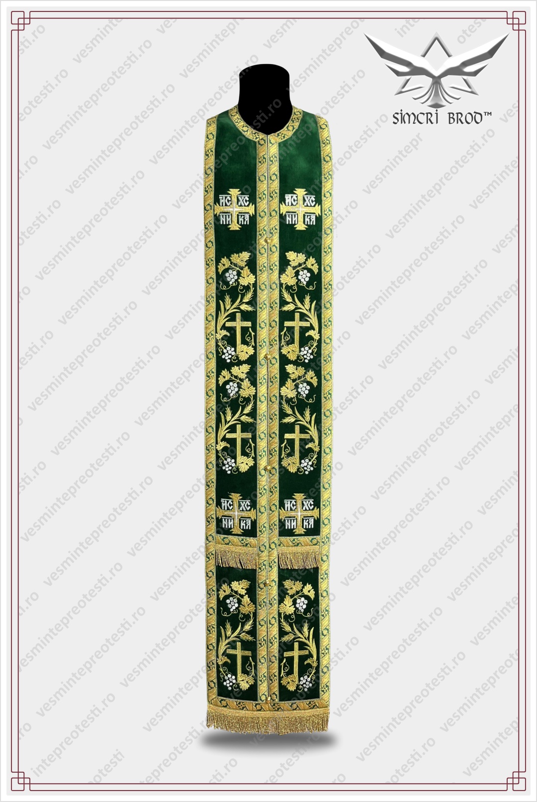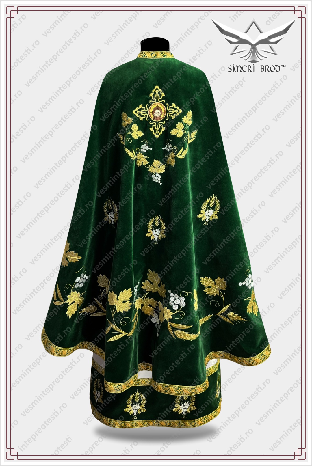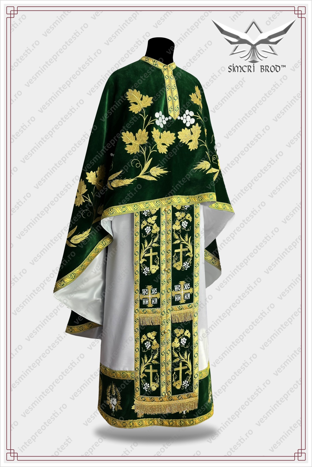 The beauty of this priest vestment is also enhanced by the material from which it is made—green velvet—which has the property of showcasing the embroidery in all its splendor.