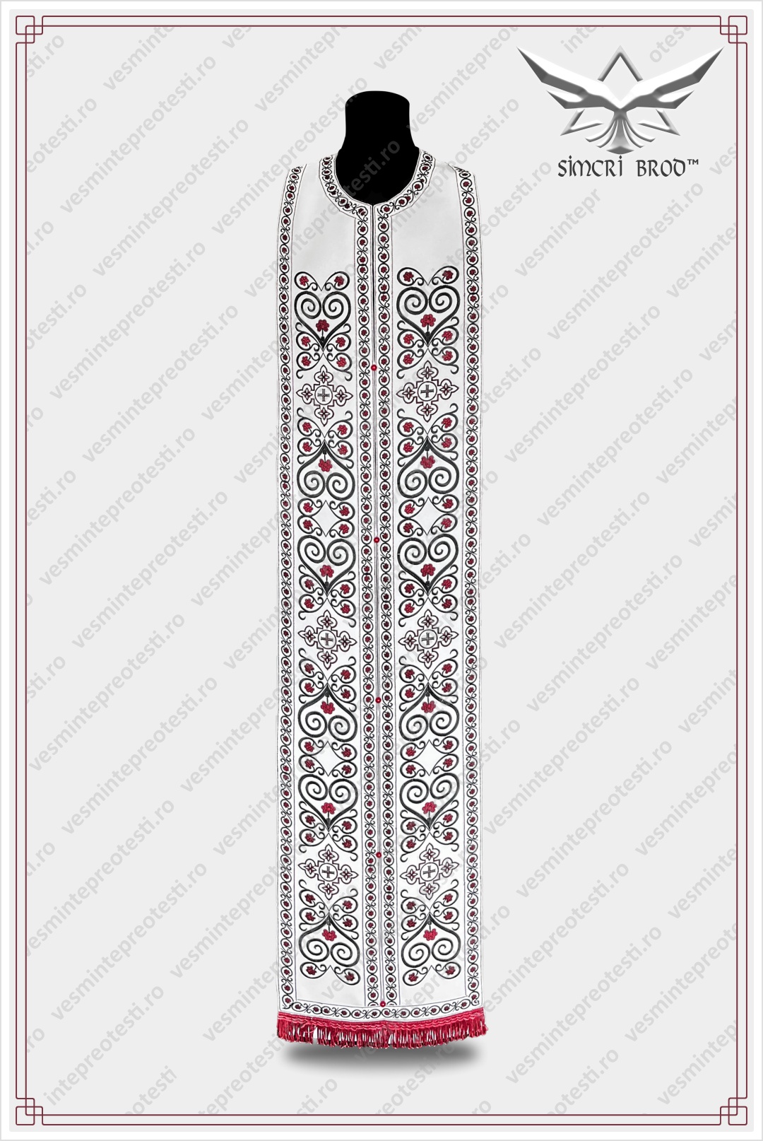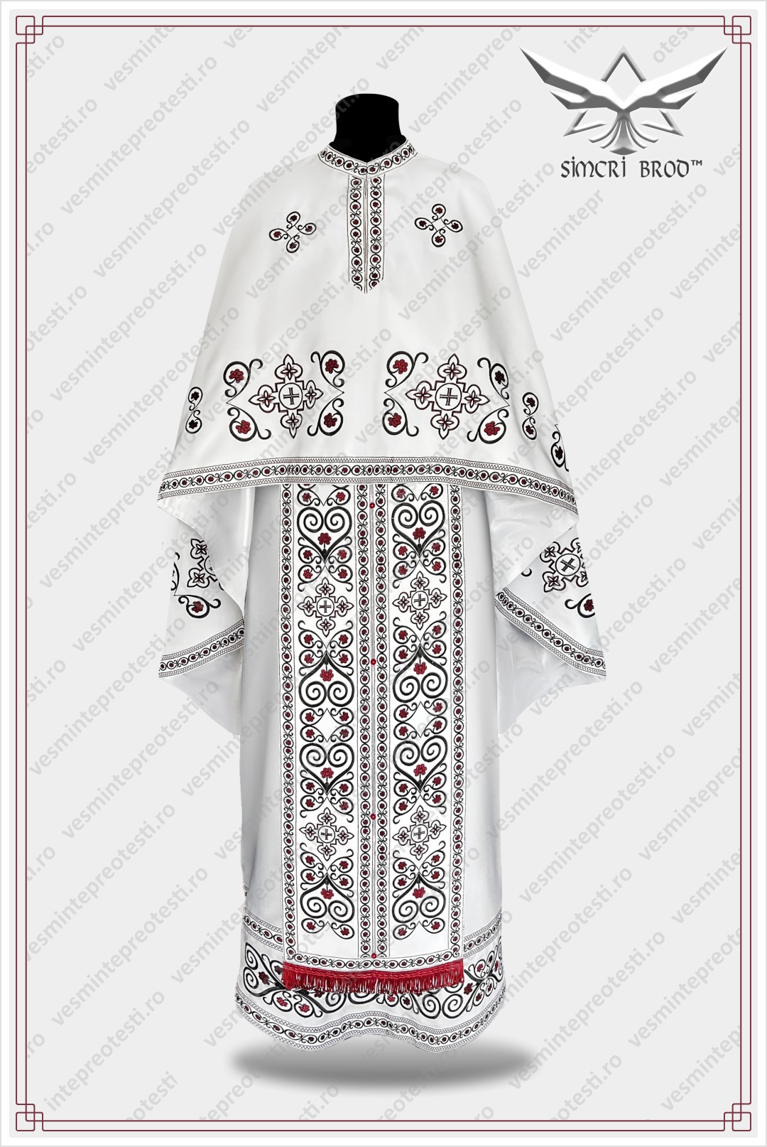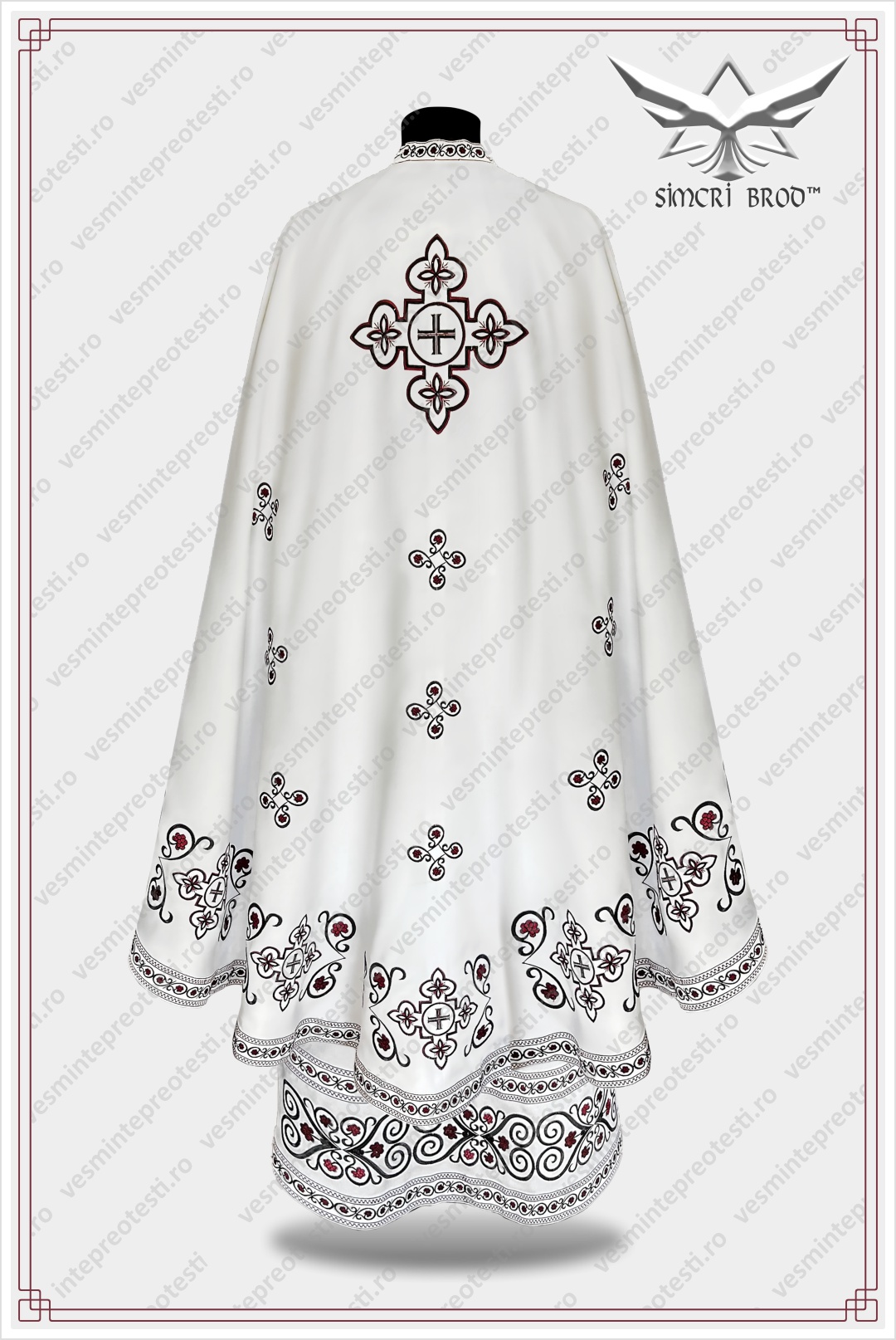 The cross, as the central element, is framed by floral arabesques, forming a border that outlines the lower part of the felonion. The same elements are found on the richly ornamented epitrachelion, as well as on the other pieces of the vestment. The elegance of the vestment comes from the embroidery design, which appears simple at first glance, the color combination of black silk thread with burgundy silk thread, and the embroidered trim that outlines each piece of the vestment.