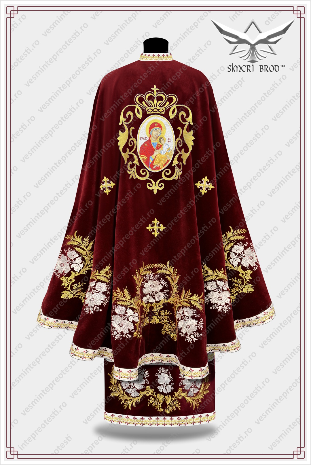 The flowers of the Greek-inspired priestly vestment, also called “ice flowers”, are surrounded by olive branches, symbolizing peace and wheat ears, symbol of the body of Christ the Savior. The crowned bicephalous eagle, present since the first Christian centuries in the churches of Mount Athos and on the flag of the Byzantine Empire, adorns the epitraphil and the coverings for the Holy Vessels.The vestment’s sash is beautifully decorated at the bottom with floral motifs around the edges, and the icon of the Virgin Mary is highlighted by Byzantine arabesques and a crown reminding us that she is the queen of Christ. The epitraphil is ennobled with the bicephalous eagle and crosses, and the stichar at the bottom has the same embroidery as the felon; the braid, the sleeves and the coverings for the Holy Vessels are also embroidered in the same tone as the vestment.The vestment is embroidered on burgundy velvet with gold thread in combination with white silk thread. The exceptional quality of the embroidery threads and the other materials that go into the vestments, make this product to keep its beauty and durability over time.