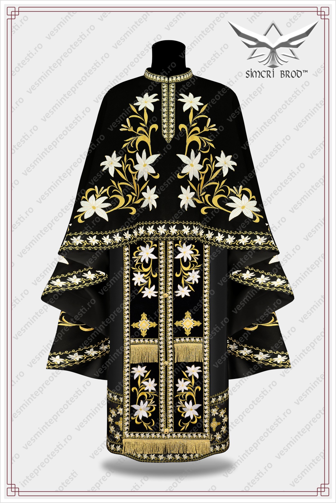 Black vestments are usually worn by church ministers during Lent or at funeral services. This vestment is embellished with lily flowers, symbol of purity and cleanliness, which form a central pattern at the back of the vestment, from which branches of flowers branch out to outline the vestment all the way to the front, at the breast.