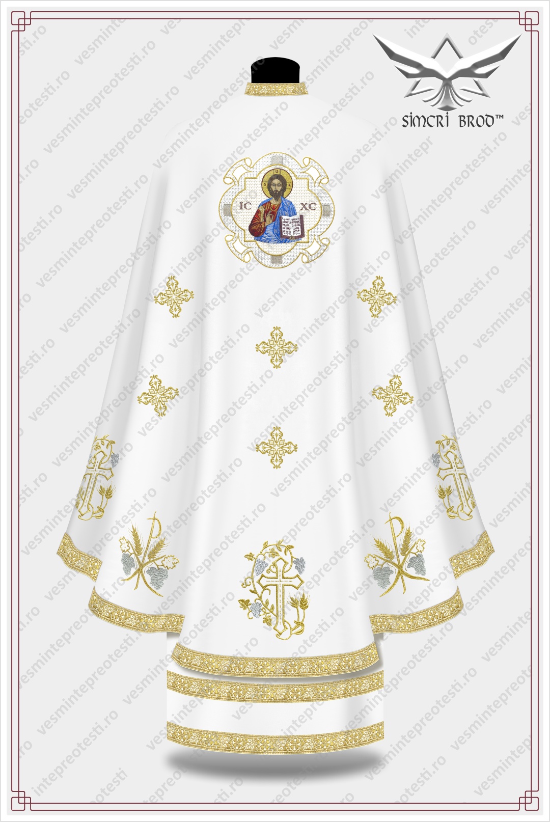 The monogram XP, the monogram of Jesus Christ, is beautifully adorned on this priestly vestment with vine branches and ears of wheat, which symbolize the Body and Blood of the Savior.