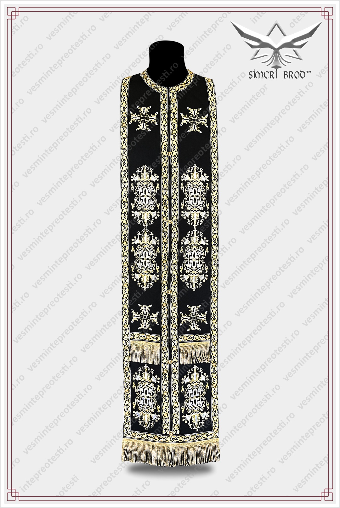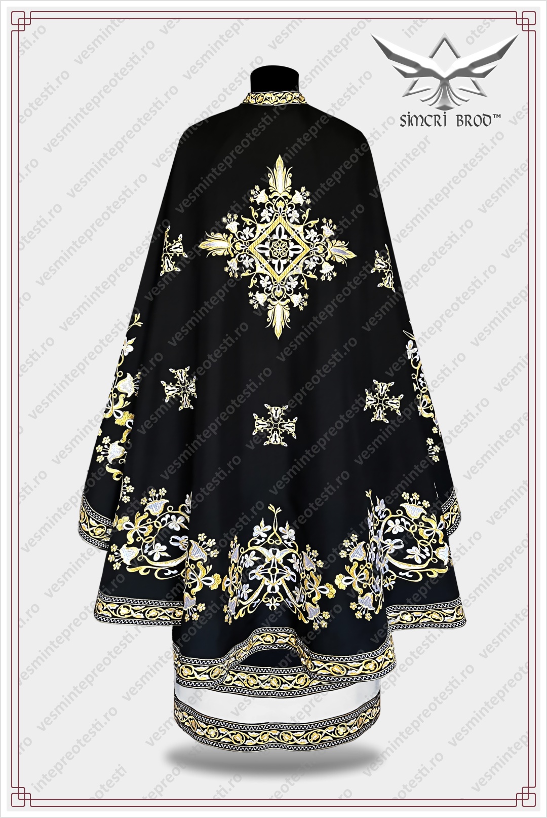 The color combination used in the embroidery—golden thread combined with white silk—gives this vestment a note of sobriety appropriate for the services where it is worn. The complexity and refinement of the embroidery make this vestment extremely elegant and distinguished; the color palette and the embroidery design itself give it a special beauty. Each cross, as the central element of the embroidery, is adorned with white flowers—symbols of purity and the light of God’s grace—thus giving it the honor and importance it deserves.