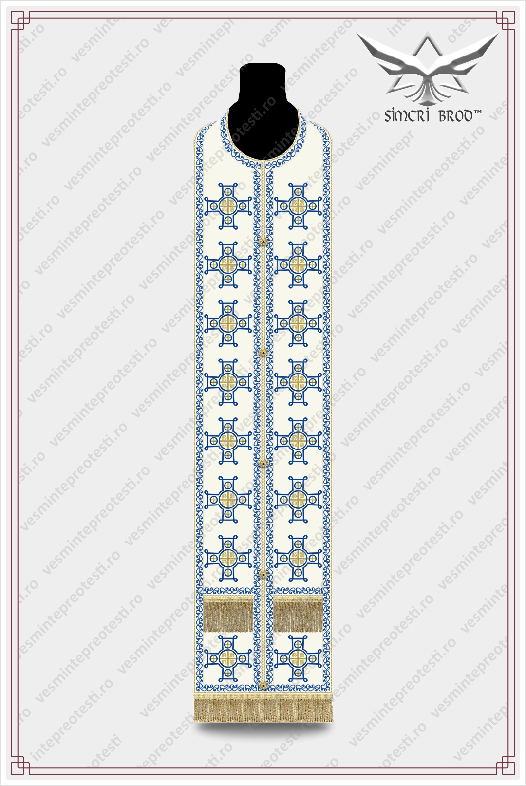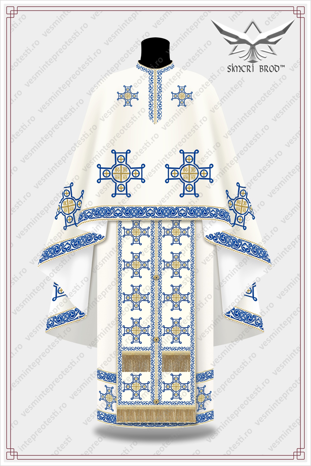 Vestments embroidered with cream-colored Byzantine crosses.